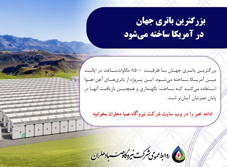 به گزارش روابط عمومی شرکت نیروگاه صبا دهلران به نقل از ایسنا، شرکت فرم انرژی(Form Energy) مستقر در سامرویل ماساچوست قصد دارد یک کارخانه کاغذ و خمیر کاغذ سابق را در شهر لینکلن ایالت مین آمریکا به مکانی که بزرگترین تاسیسات باتری جهان را در خود جای خواهد داد، تبدیل کند و تا ۸۵ مگاوات برق را به شبکه برق ایالات متحده تزریق کند.