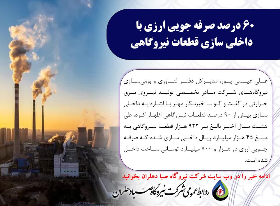به گزارش روابط عمومی شرکت نیروگاه صبا دهلران علی عیسی پور، مدیرکل دفتر فناوری و بومیسازی نیروگاههای شرکت مادر تخصصی تولید نیروی برق حرارتی در گفت و گو با خبرنگار مهر با اشاره به داخلی سازی بیش از ۹۰ درصد قطعات نیروگاهی اظهار کرد: طی هشت سال اخیر بالغ بر ۹۲۲ هزار قطعه نیروگاهی به مبلغ ۴۵ هزار میلیارد ریال داخلی سازی شده که صرفهجویی ارزی دو هزار و ۷۰۰ میلیارد تومانی ساخت داخل شده است، همچنین در سال گذشته ۹۷ هزار و ۲۹۶ به مبلغ ۲ هزار میلیارد ریال قطعات نیروگاهی داخلی سازی شده است.
