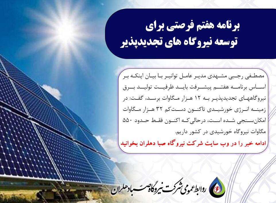 به گزارش روابط عمومی شرکت نیروگاه صبا دهلران به نقل از هشت صبح، مصطفی رجبی مشهدی مدیر عامل توانیر با بیان اینکه بر اساس برنامه هفتم پیشرفت باید ظرفیت تولید برق نیروگاههای تجدیدپذیر به ۱۲ هزار مگاوات برسد، گفت: در زمینه انرژی خورشیدی تاکنون دستکم ۳۲ هزار مگاوات امکانسنجی شده است، درحالیکه اکنون فقط حدود ۵۵۰ مگاوات نیروگاه خورشیدی در کشور داریم.