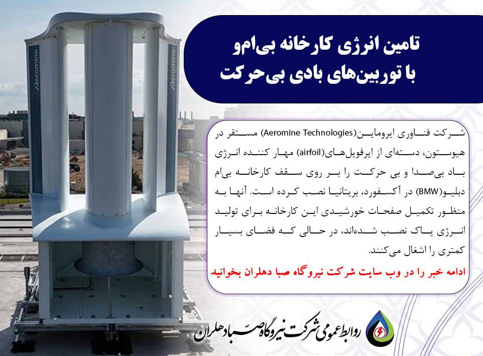 شرکت فناوری ایروماین(Aeromine Technologies) مستقر در هیوستون، دستهای از ایرفویلهای(airfoil) مهار کننده انرژی باد بیصدا و بی حرکت را بر روی سقف کارخانه بیامدبلیو(BMW) در آکسفورد، بریتانیا نصب کرده است. آنها به منظور تکمیل صفحات خورشیدی این کارخانه برای تولید انرژی پاک نصب شدهاند، در حالی که فضای بسیار کمتری را اشغال میکنند.