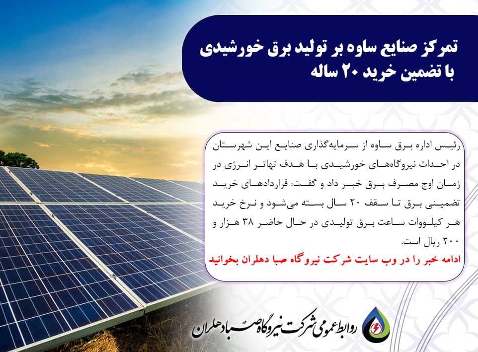 رئیس اداره برق ساوه از سرمایهگذاری صنایع این شهرستان در احداث نیروگاههای خورشیدی با هدف تهاتر انرژی در زمان اوج مصرف برق خبر داد و گفت: قراردادهای خرید تضمینی برق تا سقف ۲۰ سال بسته میشود و نرخ خرید هر کیلووات ساعت برق تولیدی در حال حاضر ۳۸ هزار و ۲۰۰ ریال است.